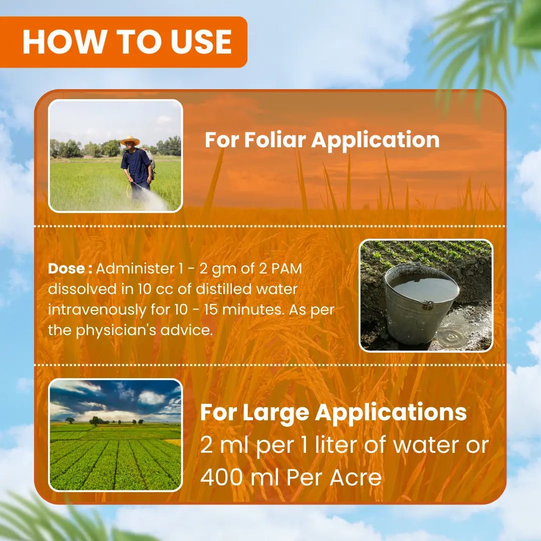 खुराक : 1 - 2 ग्राम 2 PAM को 10 cc आसुत जल में घोलकर 10 - 15 मिनट के लिए अंतःशिरा में दें। चिकित्सक की सलाह के अनुसार ऑक्सीजन या कृत्रिम सांस दें।