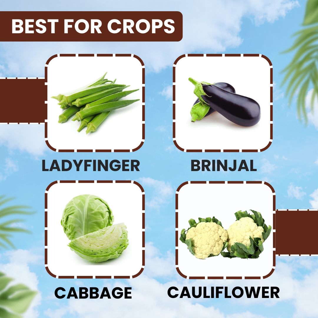 लक्ष्य फसल: भिंडी, बैंगन, पत्तागोभी, मिर्च, फूलगोभी, आम, गुलाब, कपास, प्याज, आलू और टमाटर सहित विभिन्न प्रकार की फसलों के लिए उपयुक्त।