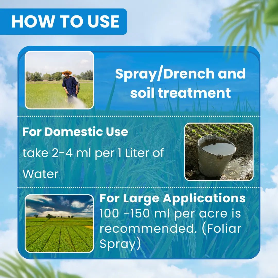 कैसे उपयोग करें: 2.1 मिलीलीटर फॉर्मूलेशन को 1 लीटर पानी में घोलें और पौधे की पत्ती पर स्प्रे करें