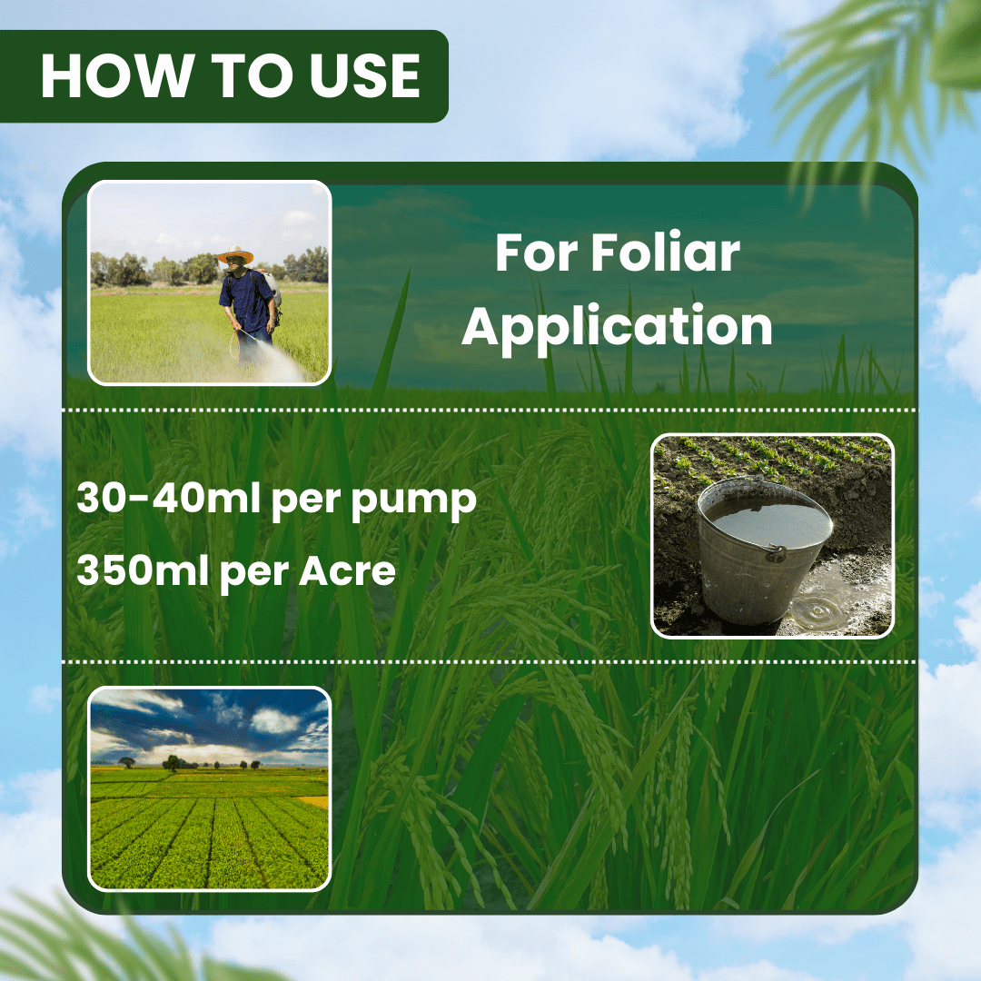 खुराक: 30-40 मि.ली. प्रति पंप, 350 मि.ली. प्रति एकड़।