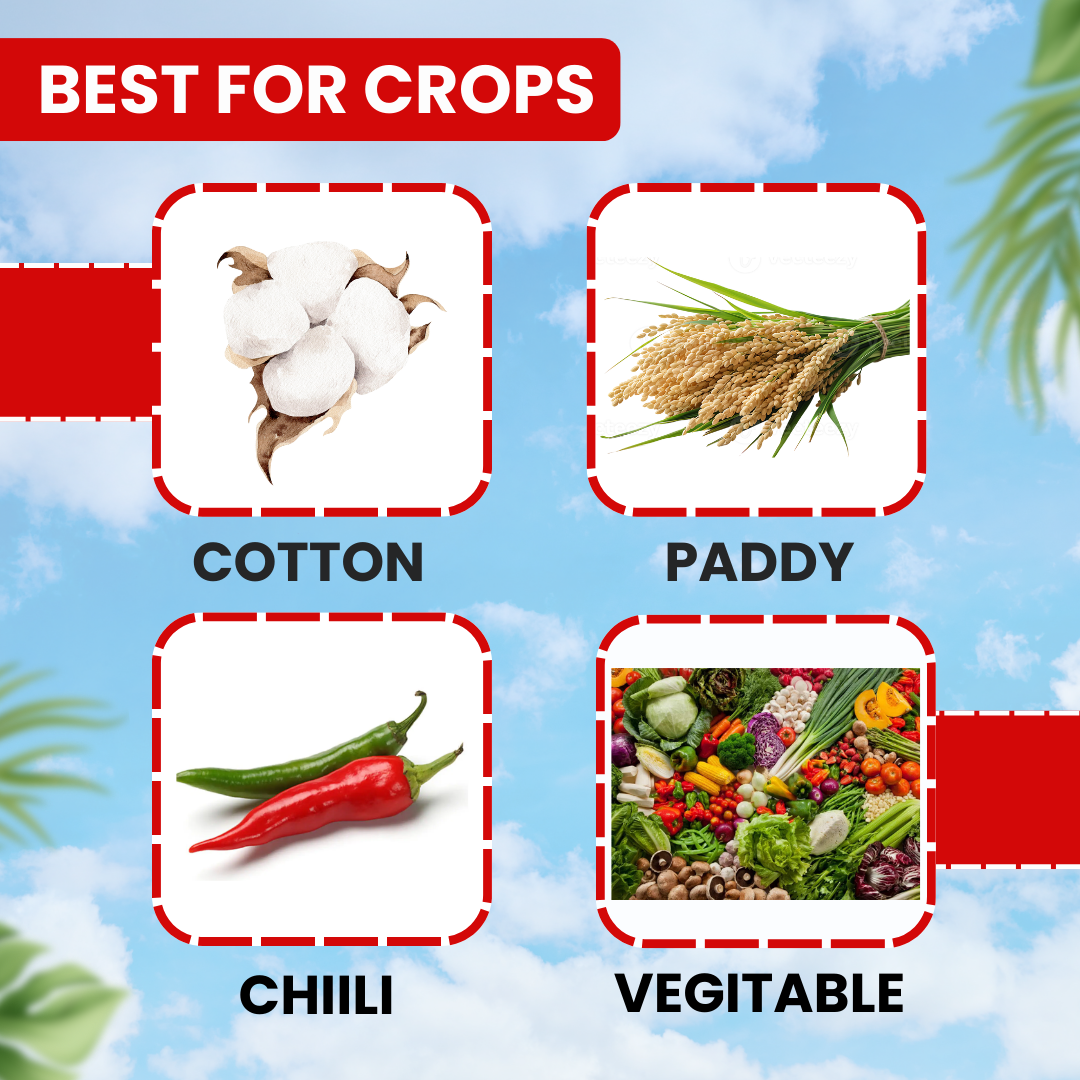 Cotton: Controls bollworms, jassids, aphids, and thrips.
