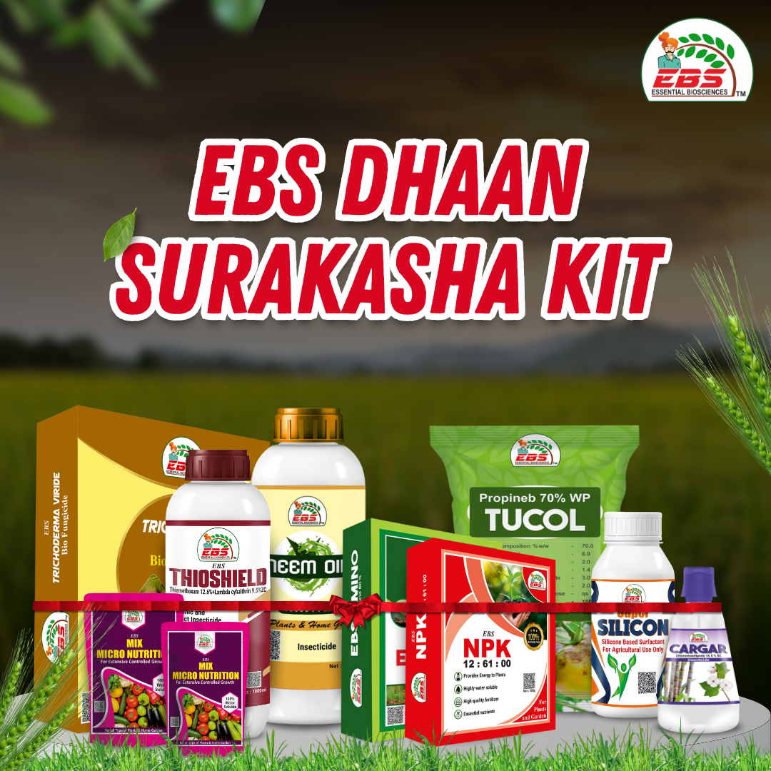 EBS is introducing the Dhaan Suraksha Kit, a comprehensive package that includes all the necessary products for promoting the growth of paddy crops during the Kharif season. The kit contains a variety of nutrient-rich products that improve yields, support plant health, and ensure sustainable farming practices.