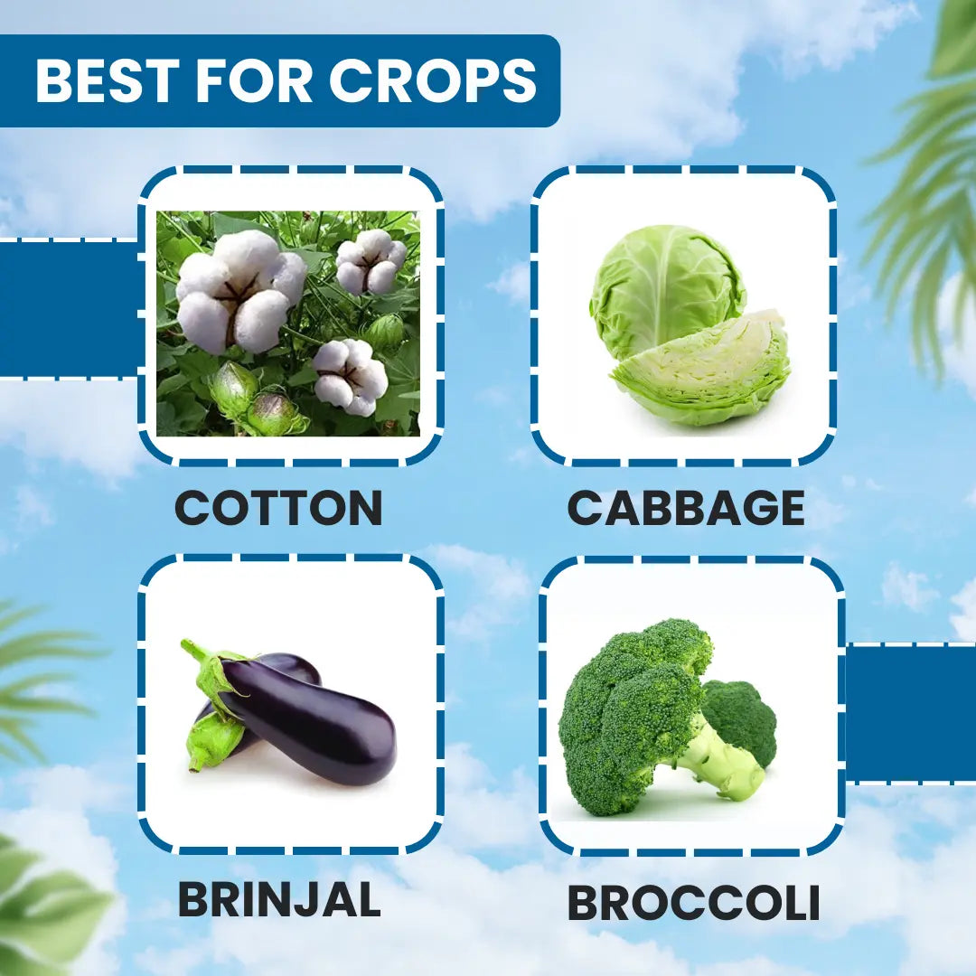 Vegetables (Tomato, Okra, Brinjal, Cabbage): Protects against thrips, aphids, and whiteflies.