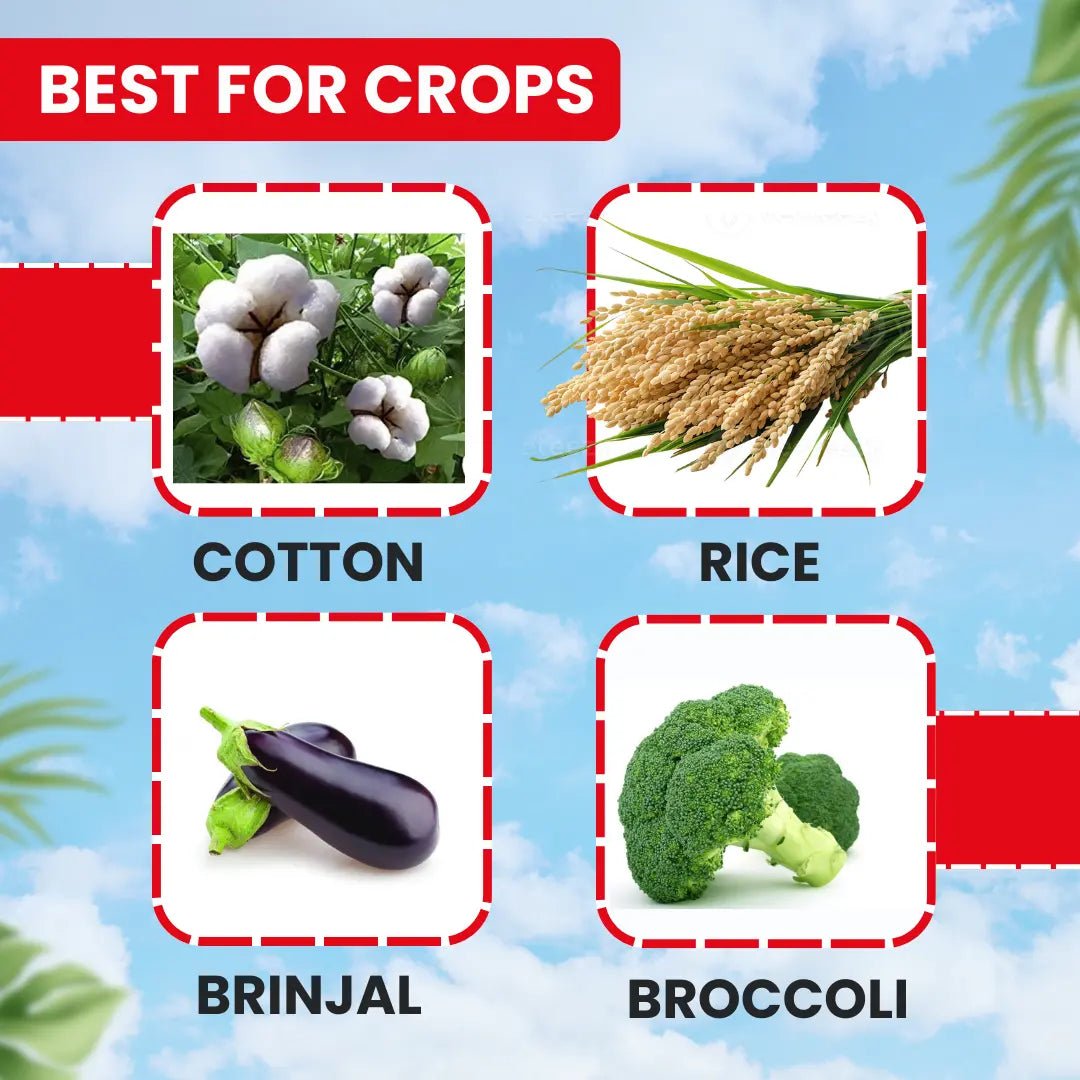 Vegetables (Tomato, Brinjal, Cabbage, Okra): Controls fruit borers, thrips, and whiteflies.