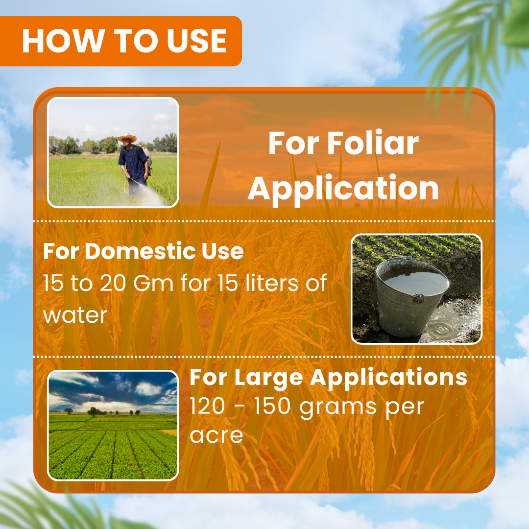 • Foliar Spray: 0.3–0.5 g per litre of water (depending on crop and pest severity).